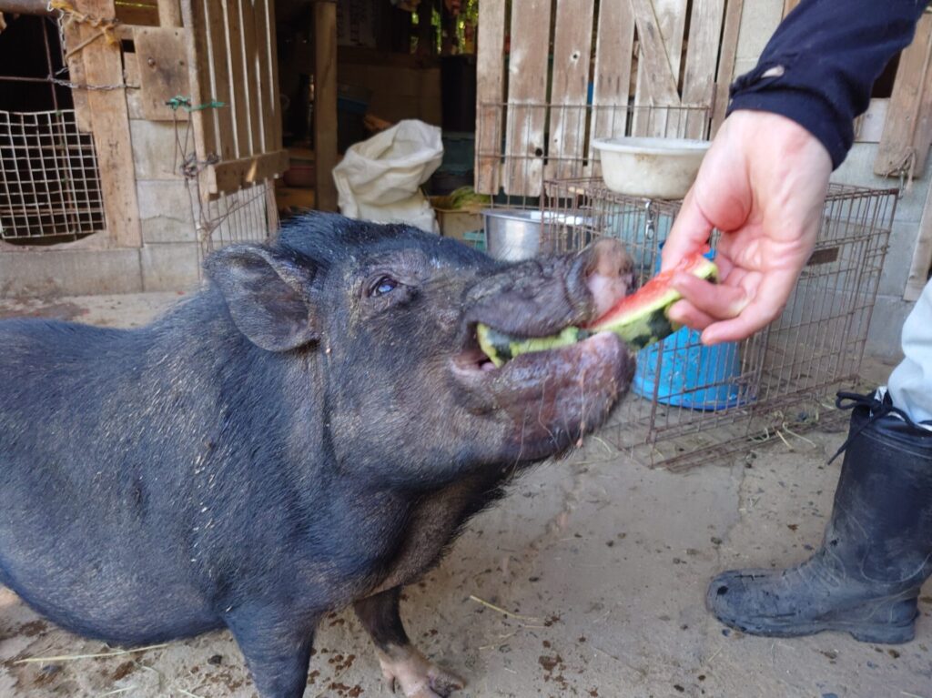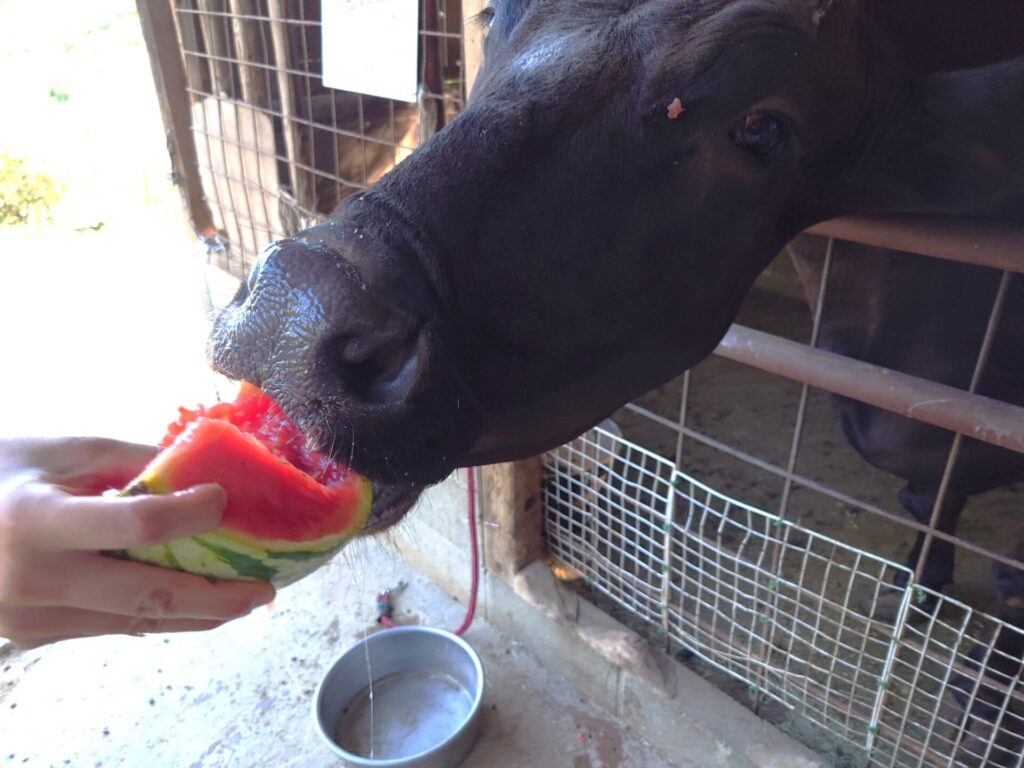 暑さでバテていた和牛のなごみちゃんや、ミニブタのあずきちゃんたちも嬉しそう。豪快にかぶりついていました。