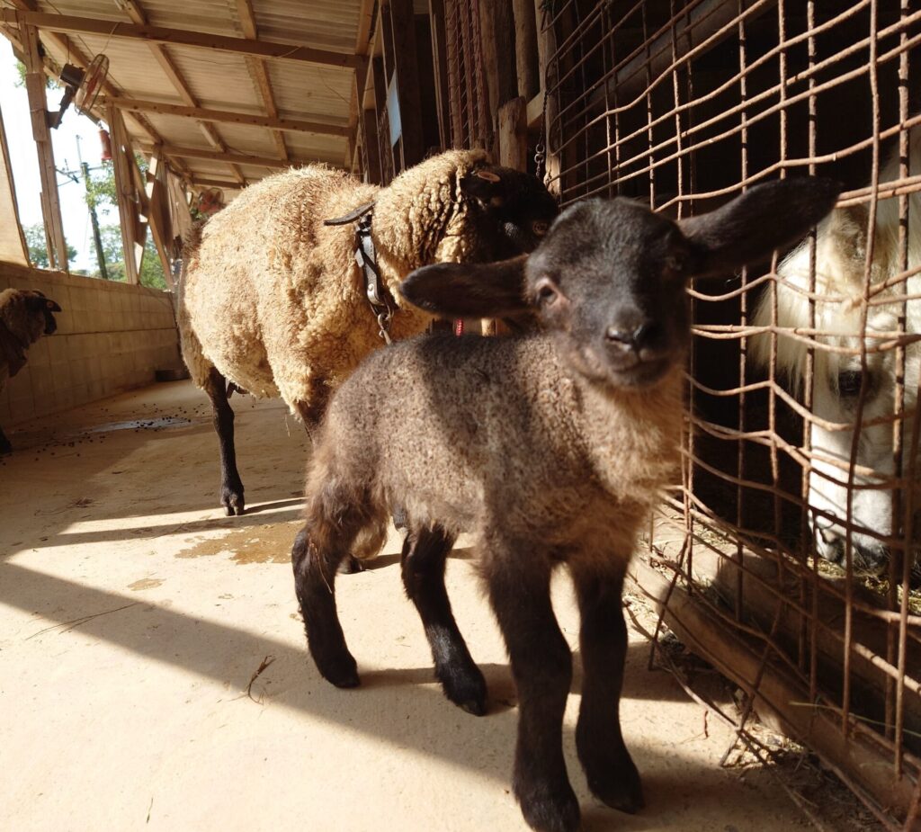 9月12日、ヒツジの女の子が生まれました!種類はサフォークという顔や足が黒い種類です。