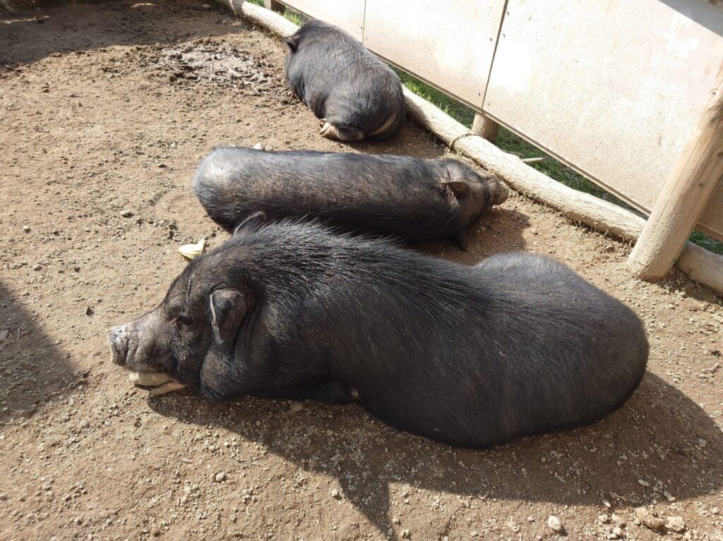 ホームブログ ミニぶたぶたぶた 2025.12.02 10月から新しくミニブタ広場ができました。 今までウッドデッキ暮らしだったミニブタのかりんちゃんが、新入園の友達ぶたといっしょに暮らしています。 川の字になって3頭並んでひなたぼっこ。 見ているだけで癒やされます・・・。